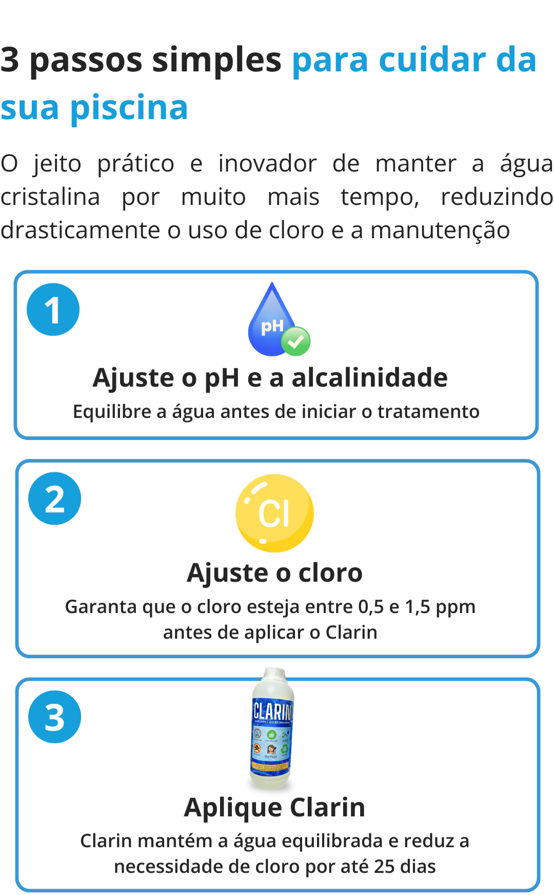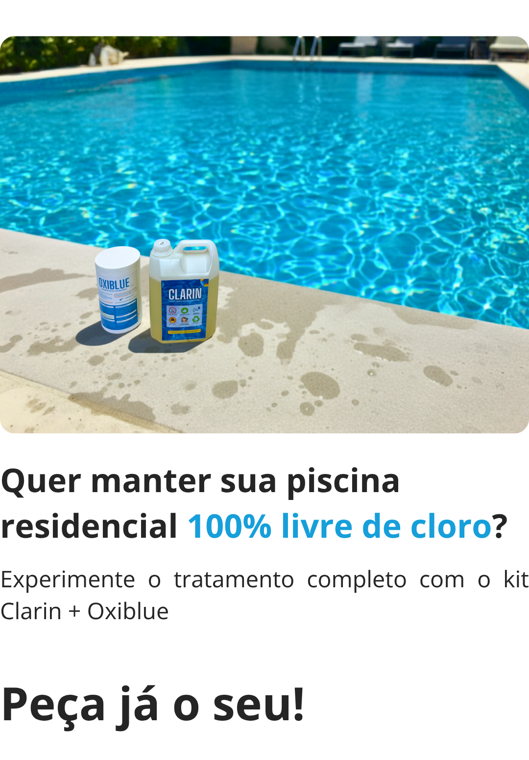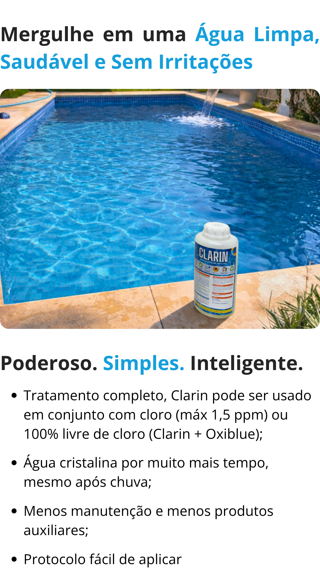 Desde que comecei a usar o clarin, meu trabalho com a piscina ficou muito mais prático e a água bem melhor.