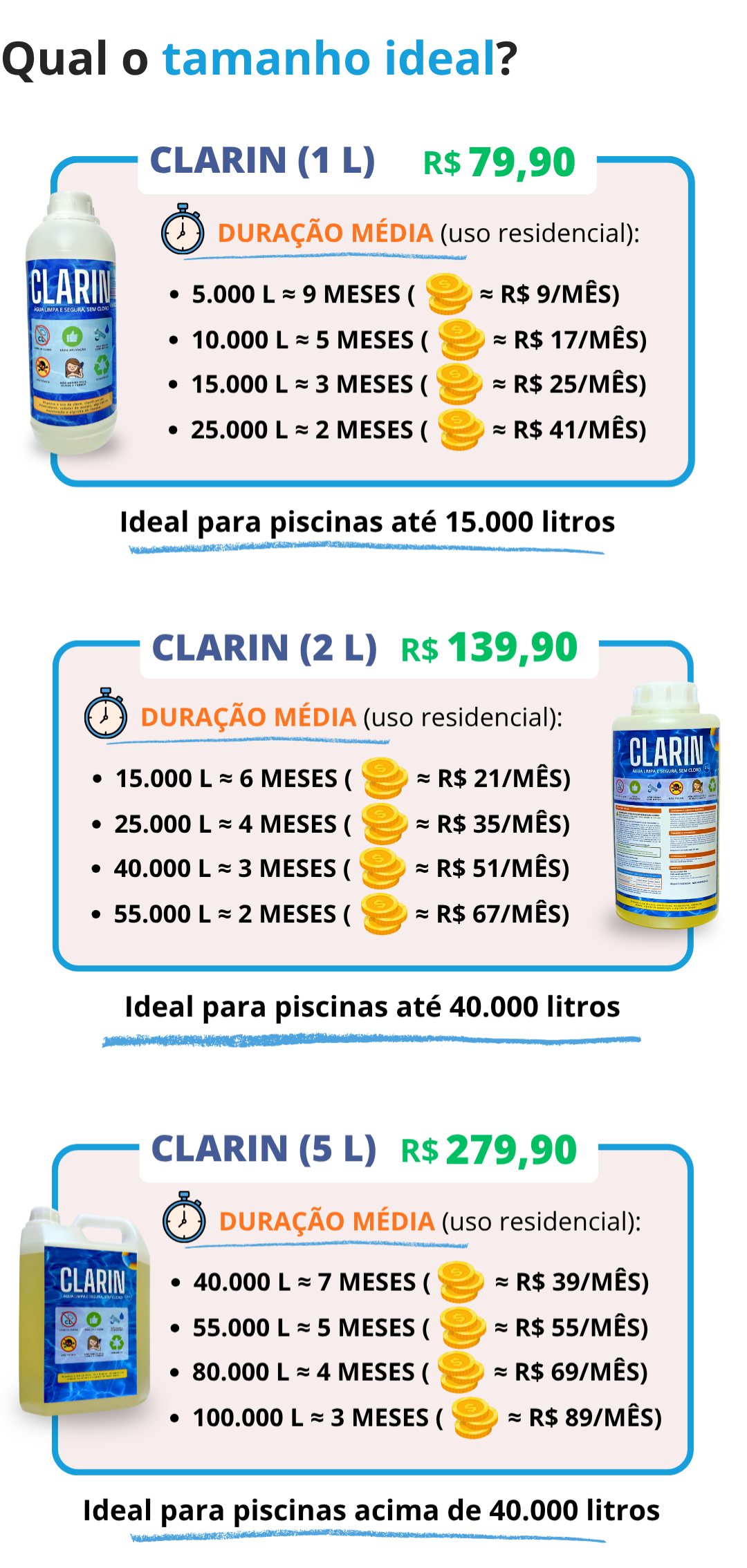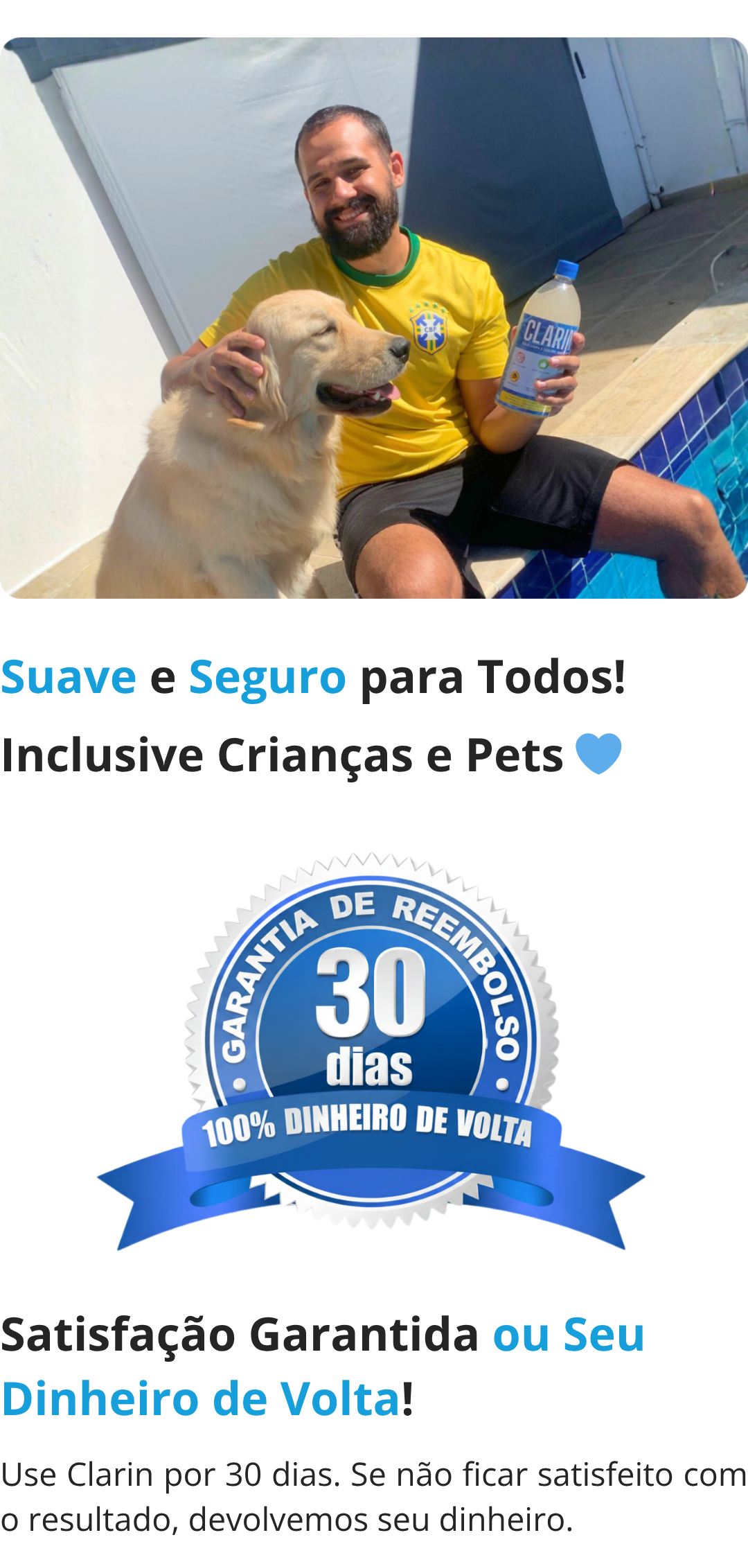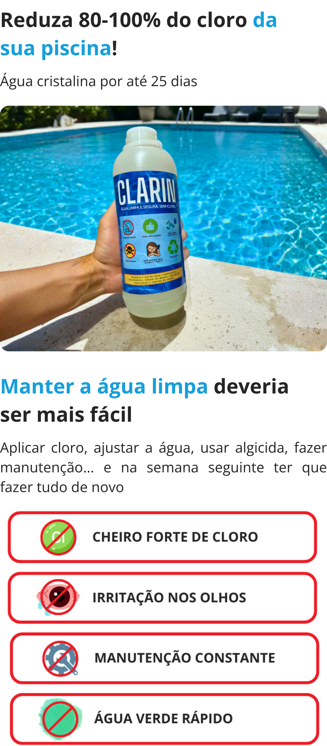 Desde que comecei a usar o clarin, meu trabalho com a piscina ficou muito mais prático e a água bem melhor.