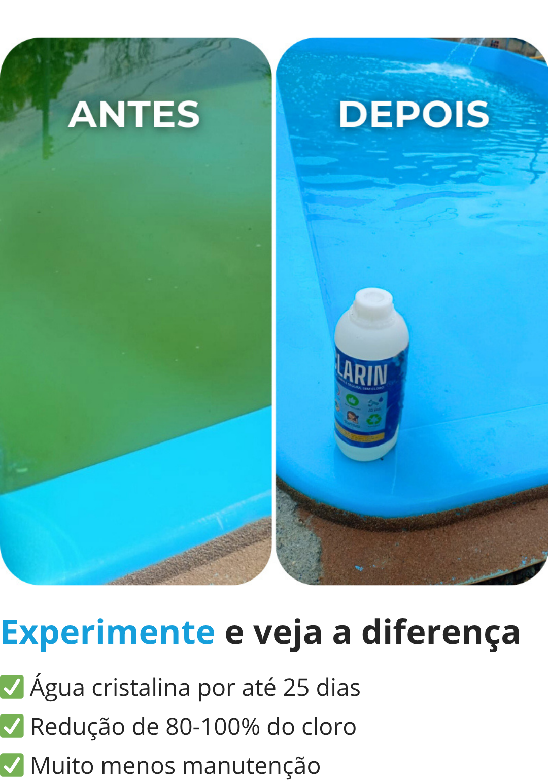 é incrível como um produto tão prático pode manter a água limpa por até mais de 30 dias. Clarin é top!